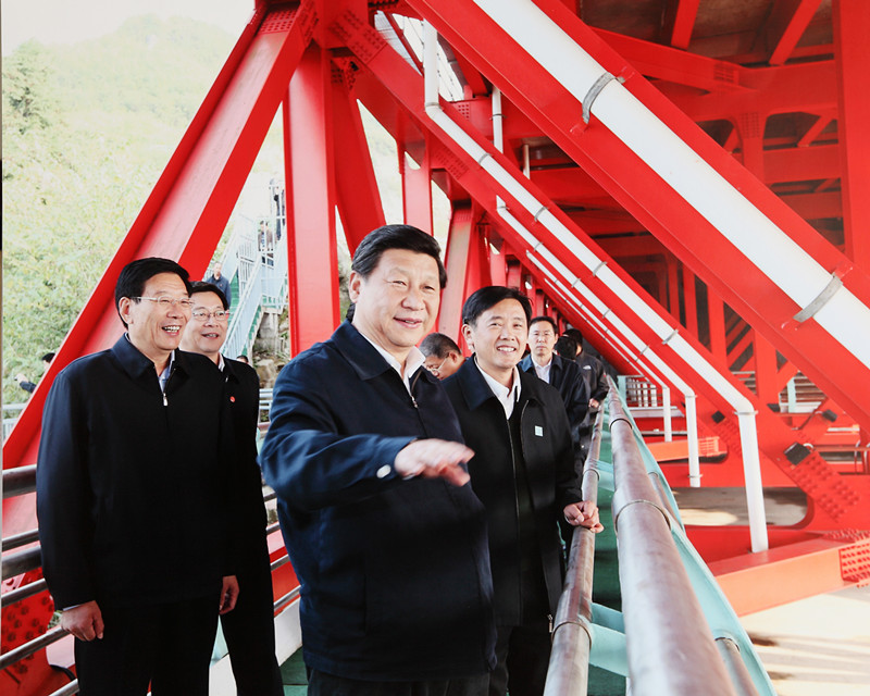 中央兩家重量級(jí)媒體《人民日?qǐng)?bào)》、央視《新聞聯(lián)播》的連續(xù)報(bào)道是黨和國(guó)家領(lǐng)導(dǎo)人對(duì)集團(tuán)承建的矮寨大橋的肯定與褒獎(jiǎng)的延續(xù)。矮寨大橋在建和建成通車(chē)后,多位黨和國(guó)家領(lǐng)導(dǎo)人前往視察,讓我們?cè)俅沃販剡@些時(shí)刻:2011年6月,時(shí)任國(guó)家政協(xié)主席賈慶林視察矮寨大橋;2012年5月,時(shí)任國(guó)務(wù)院總理溫家寶視察矮寨大橋;2013年11月3日,習(xí)總書(shū)記在視察矮寨大橋時(shí)贊譽(yù):“月亮不僅僅是外國(guó)的圓,這就是中國(guó)的圓月亮!”